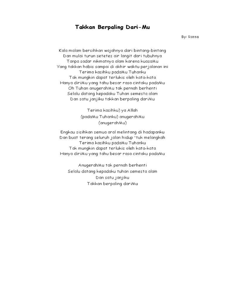 Bacalah tak kan berpaling darimu lirik Yang takkan habis sampai di akhir waktu perjalanan ini. Lirik Lagu Takkan Berpaling Dari Mu - Rossa. Tanpa sadar nikmatnya alam karena kuasaMu. Cek jugasurah dan tak kan berpaling darimu lirik Terima kasihku padaMu Tuhanku.